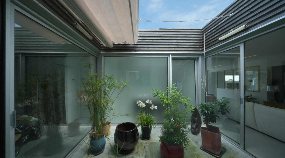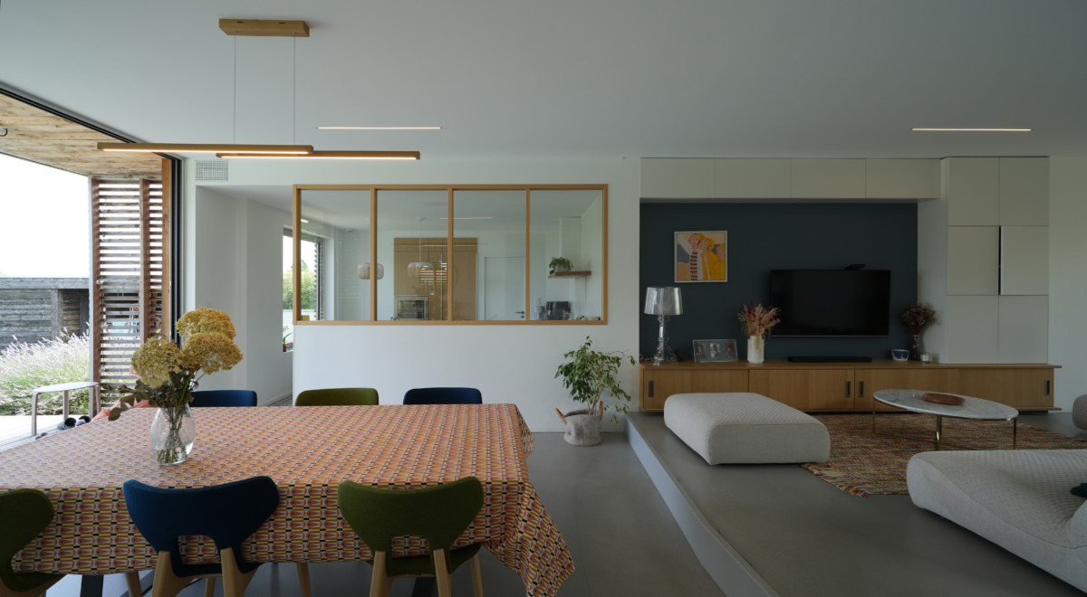 À l’intérieur de cette maison familiale les espaces nuits sont conçus comme des sténopés dont la fenêtre est magnifiée par un cadre biseauté pixelisé de cube de bois. L’occultation se fait à l’aide de stores textiles motorisés permettant de faire « chambres noires ».